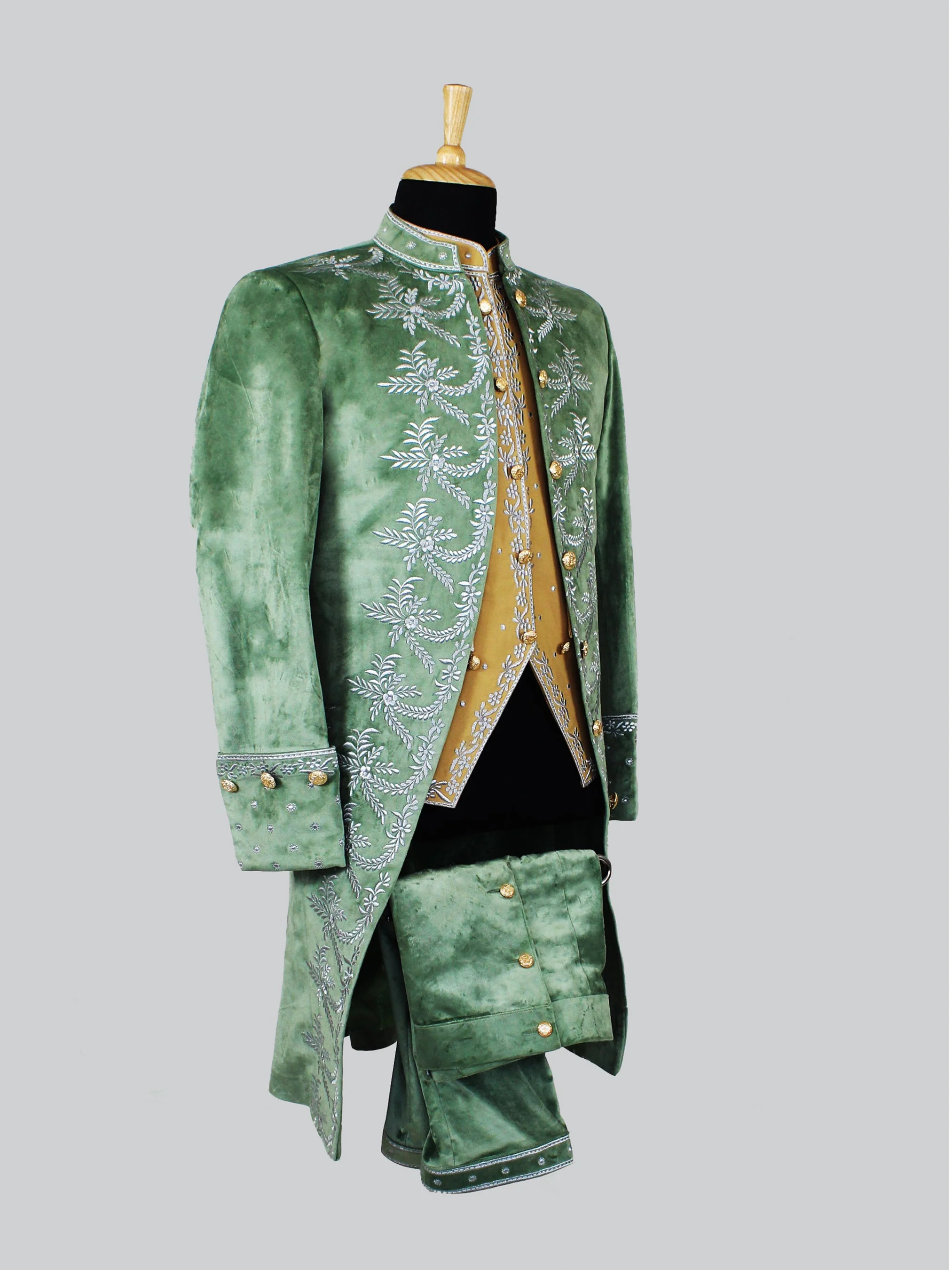 This 1800s Fersen Court Suit is made from the finest cotton and luxurious velvet fabric. An elegant silver embroidery, a cotton waistcoat, a long coat with box pleats on the back, flap pockets, folded cuffs, golden buttons, and breeches below the knee are some of the highlights.