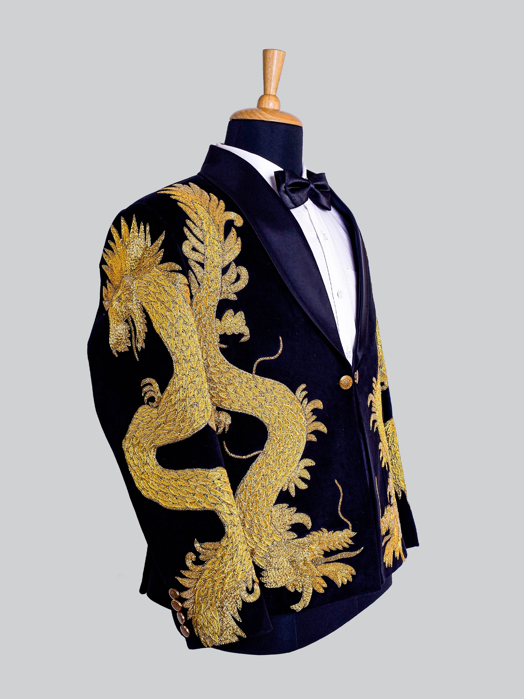 A dragon tuxedo jacket blazer is embellished with zardozi golden embroidery, and this blazer is made from luxurious velvet fabric. Our skilled artisans customized this blazer with wonderful golden-hand embroidery. The features include beautiful golden embroidery, a single-breasted blazer with a shawl lapel, button closure, dragon embroidery, and golden buttons. You can wear this Zardozi golden embroidered blazer to weddings, cocktails, and prom parties.