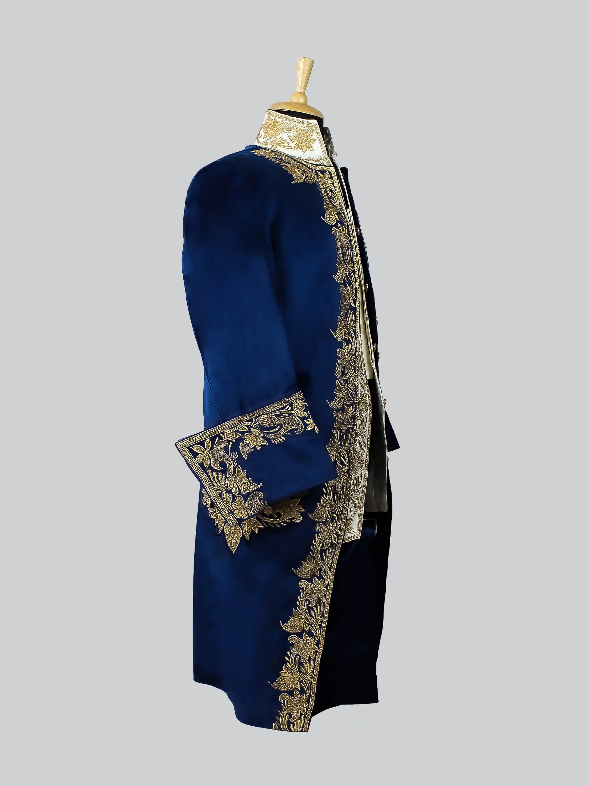 A Stunning-looking Royal French Noble Costume is made from lavish velvet and fine paisley fabric. The suit is adorned with golden accents, the golden embroidery adds a touch of glory and elevates the suit to an extraordinary level. The features include beautiful golden embroidery, a paisley fabric waistcoat, knee length long coat, folded cuffs, golden buttons, and breeches below the knees.
