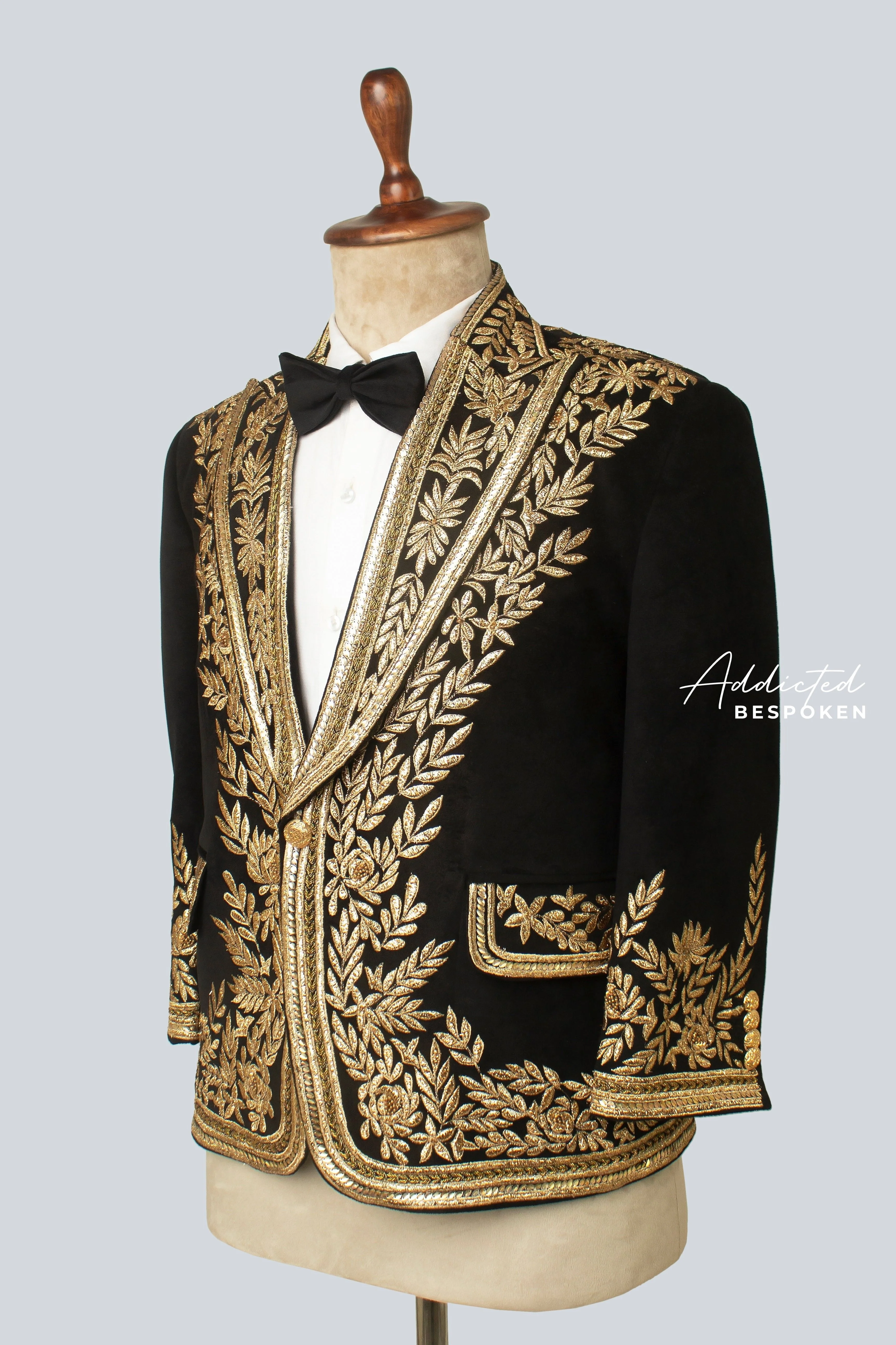 Shera Embroidered Jacket is a masterpiece that effortlessly blends sophistication and bold design. Made from Lavish Velvet fabric. This black jacket is a canvas of sophistication, meticulously adorned with intricate embroidery that exudes opulence. The classic black backdrop accentuates the shimmering golden details, creating a mesmerizing interplay of contrasts. Make a statement that resonates with luxury and individuality—choose the Shera embroidered jacket and let your style speak volumes with Addicted Bespoken.